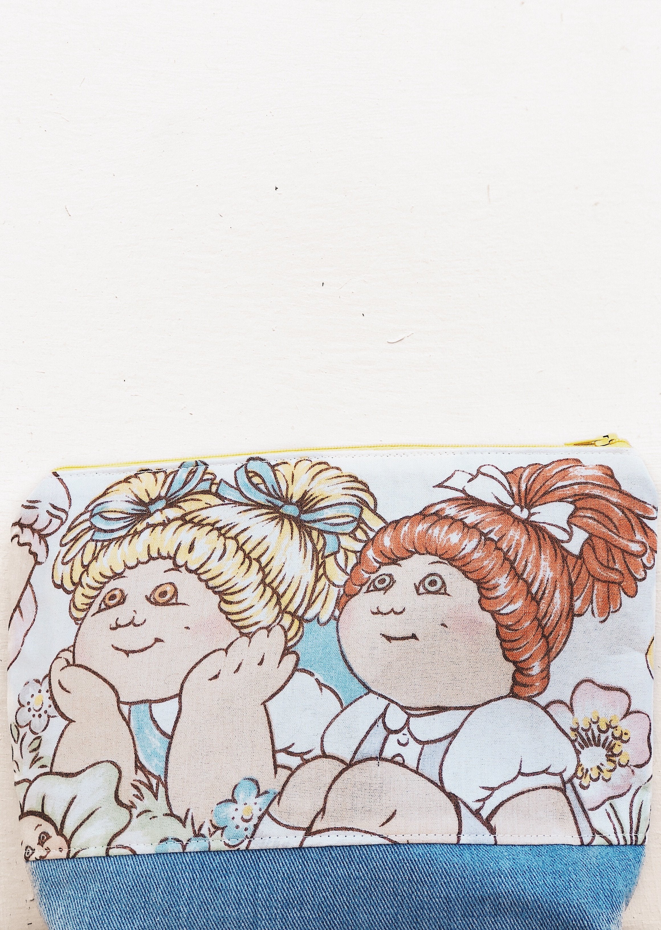 Made of 100% cotton, reinforced vintage sheets and vintage 1980's soft denim, this zipper pouch features a few of your favorite Cabbage Patch Kids on both sides.